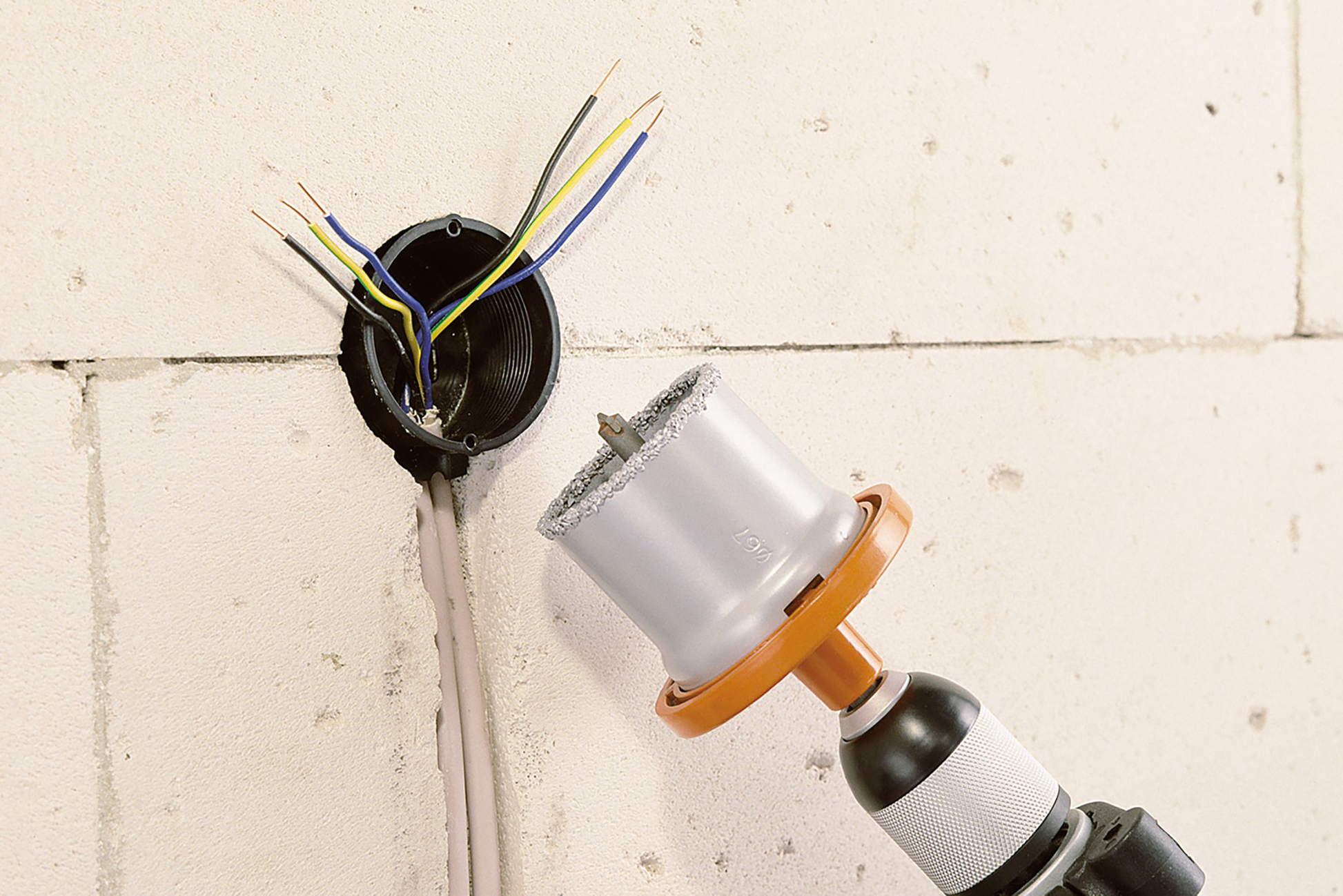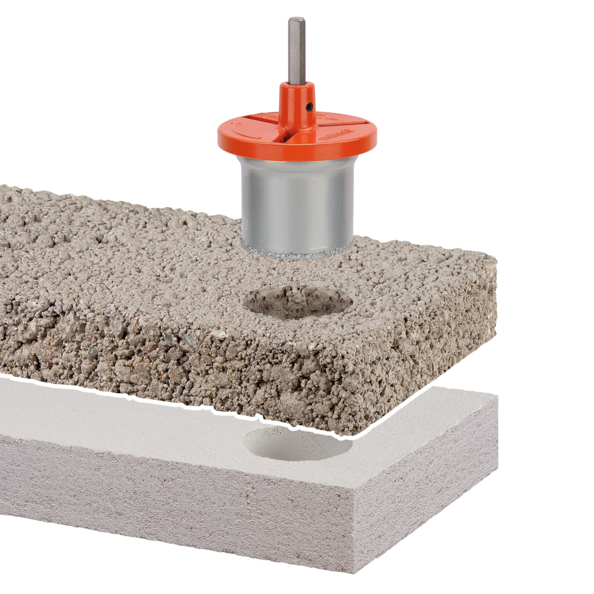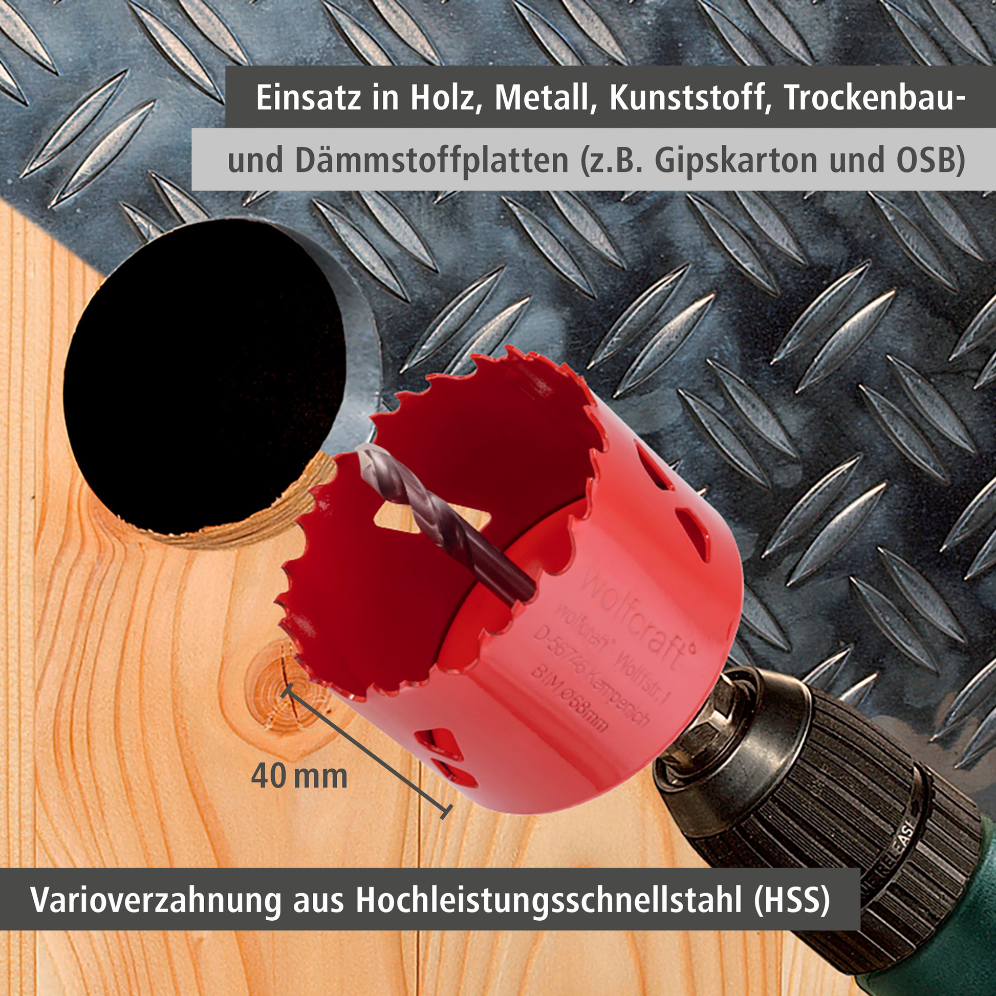 - Ø 33, 53, 68, 73 und 83 mm, 55 mm Schnitttiefe für passgenaue Bohrungen für Sanitär- und Elektroinstallationen