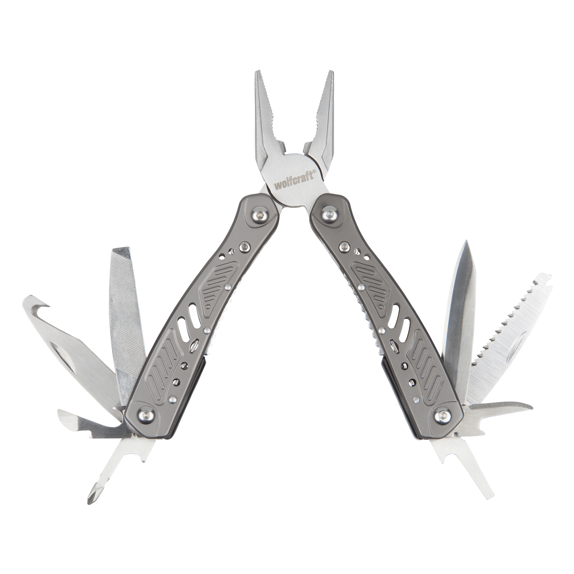 - Spitzzange, Kombizange, Drahtschneider, Messerklinge, Stechahle, Phillips®-Schraubendreher, Säge, beidseitige Feile (Holz + Metall), Schlitz-Schraubendreher, Flaschenöffner, Dosenöffner, Hakenklinge