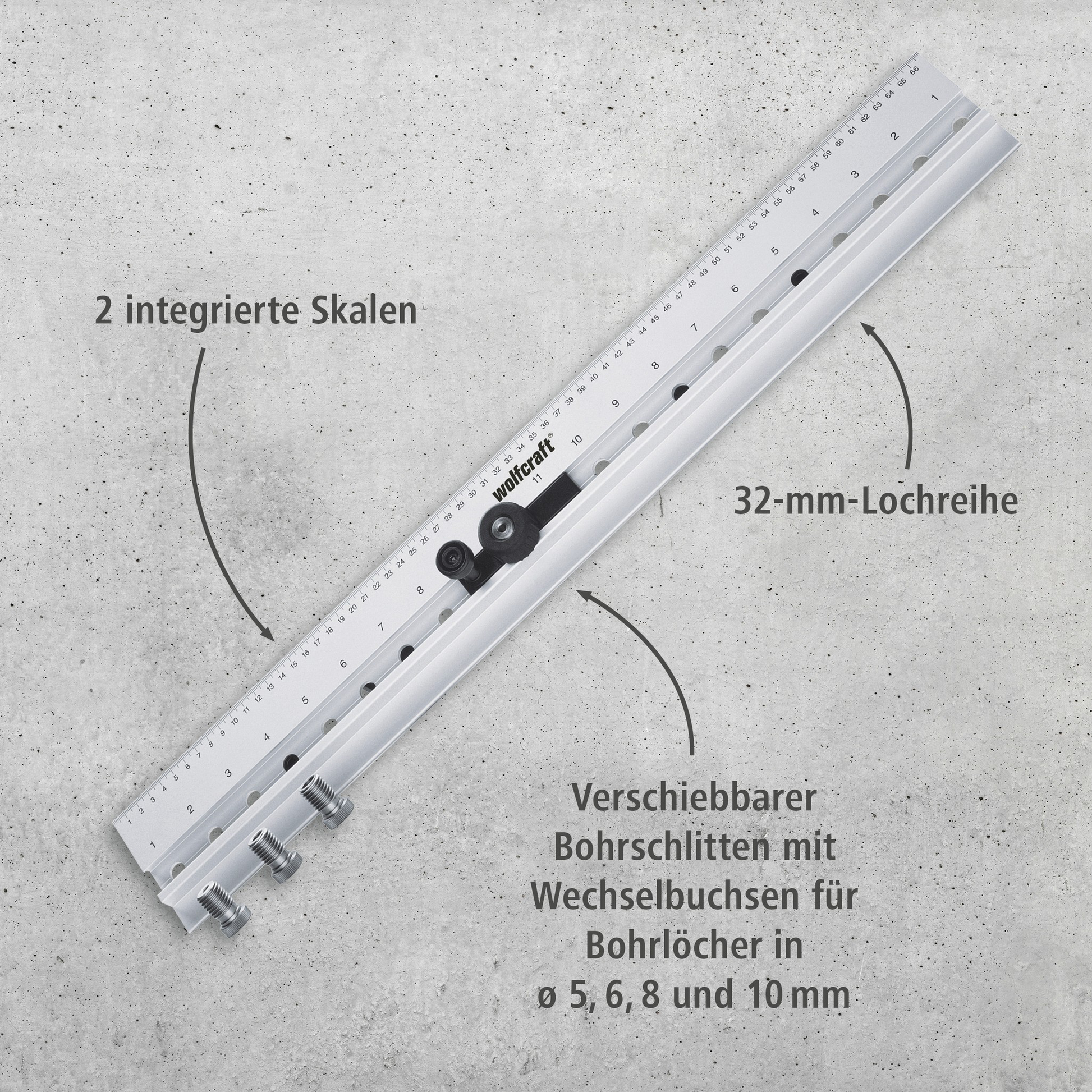 - 2 integrierte Skalen, 32er-Lochreihe, verschiebbarer Bohrschlitten mit Wechselbuchsen für Bohrlöcher in 5, 6, 8 und 10 mm Ø