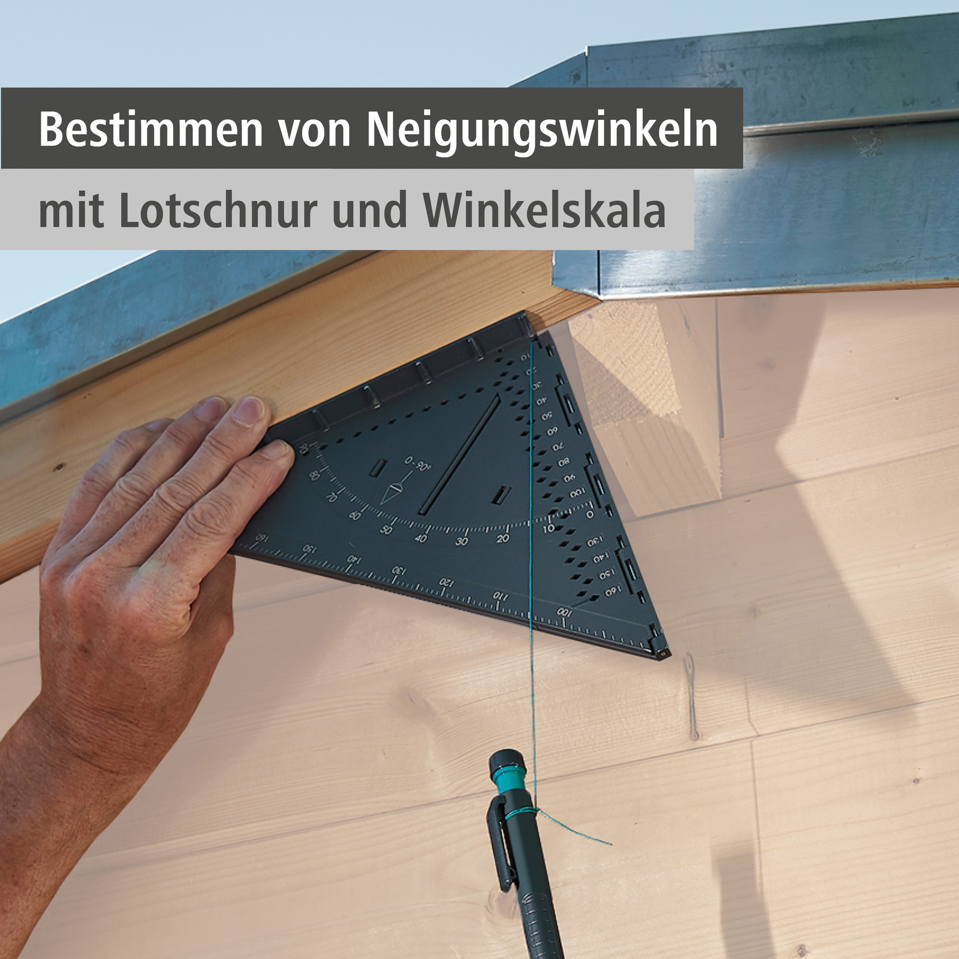 Selbst bei der Ermittlung von Neigungswinkeln z.B. an Dachschrägen leistet der Mess- und Markierwinkel VARIO 3D PRO ganze Arbeit. Mit Hilfe der der integrierten Lotschnur können Sie die Gradzahl direkt auf der Winkelskala ablesen.
