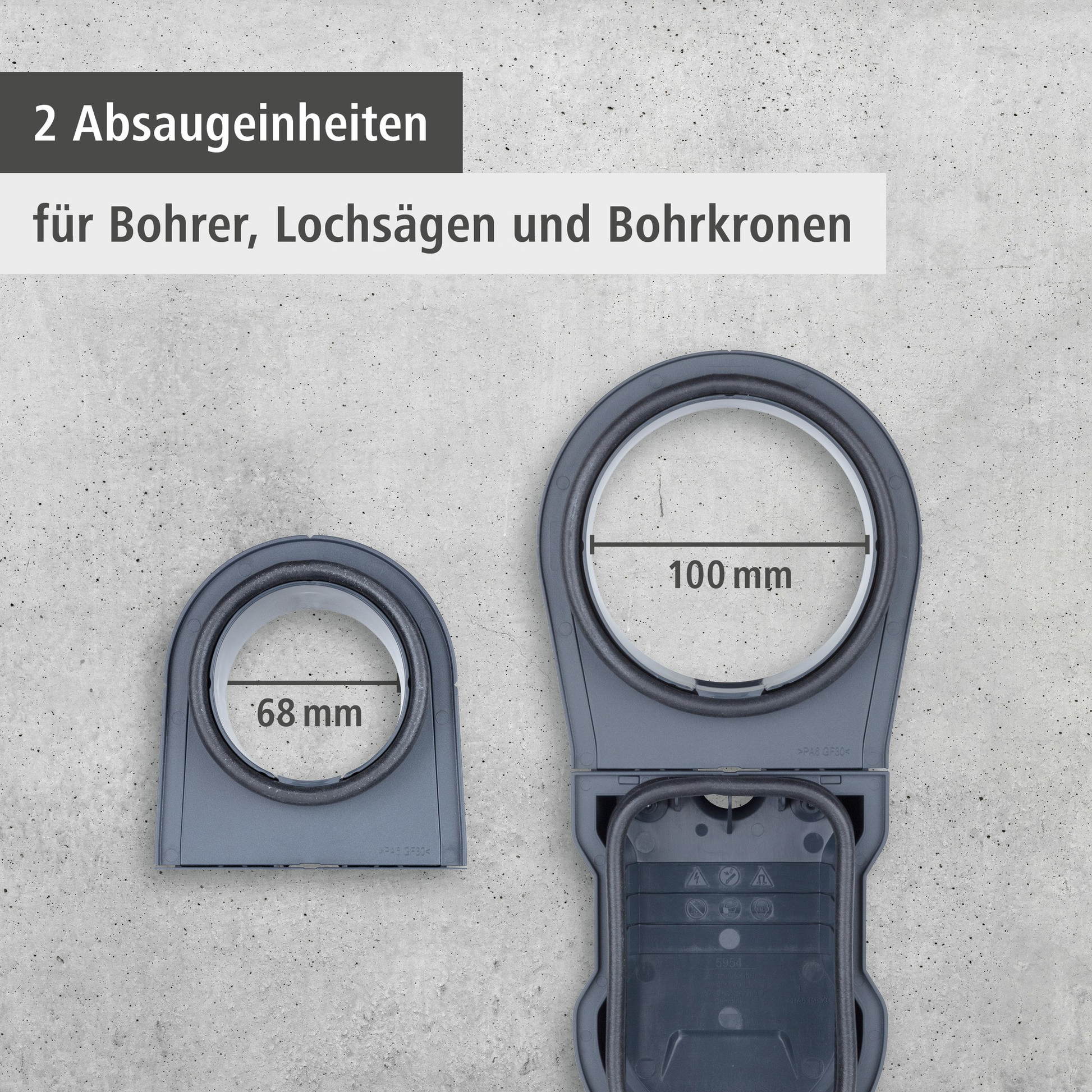 - 2 Absaugeinheiten Ø 68 und 100 mm für Bohrer, Lochsägen und Bohrkronen in verschiedenen Größen und vielfältige Einsatzmöglichkeiten