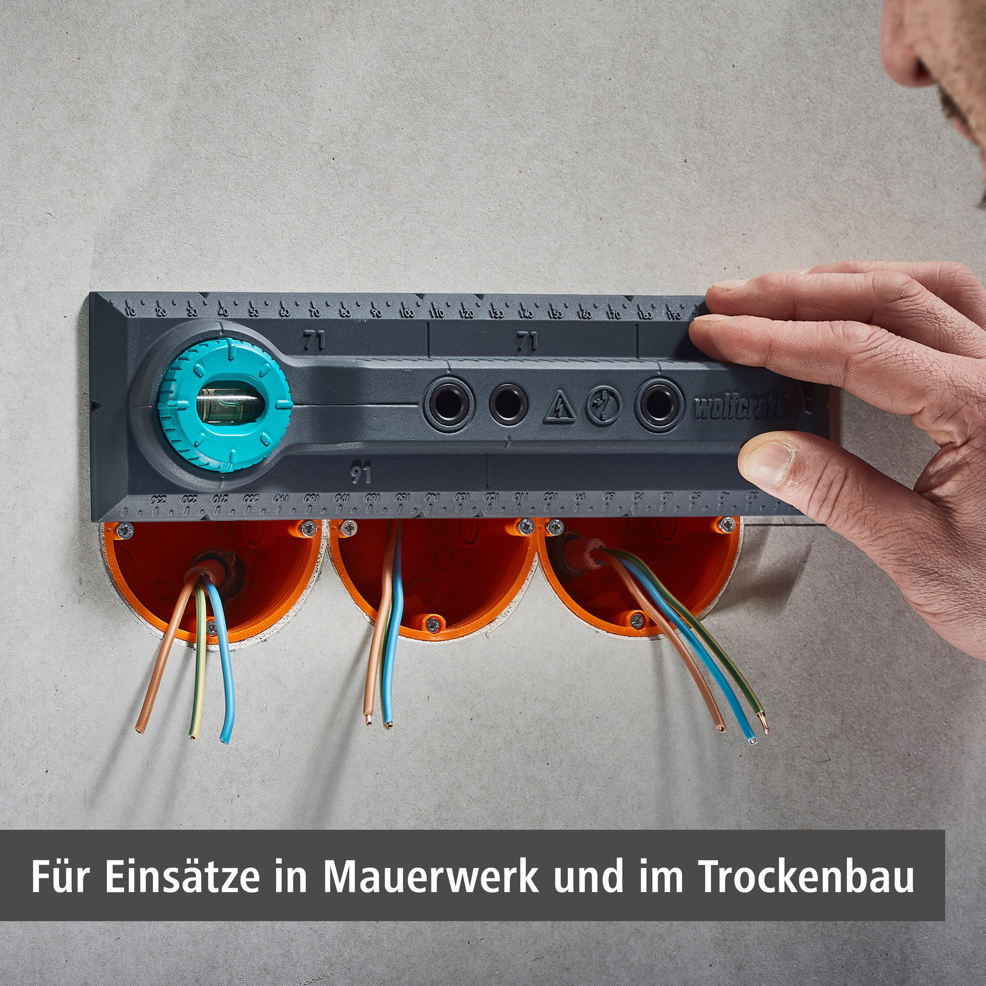 - 71- und 91-mm-Markierungen zum komfortablen Übertragen der korrekten Abstände zwischen zwei Installationsdosen sowie Steckdosen und TV- oder Netzwerkdosen