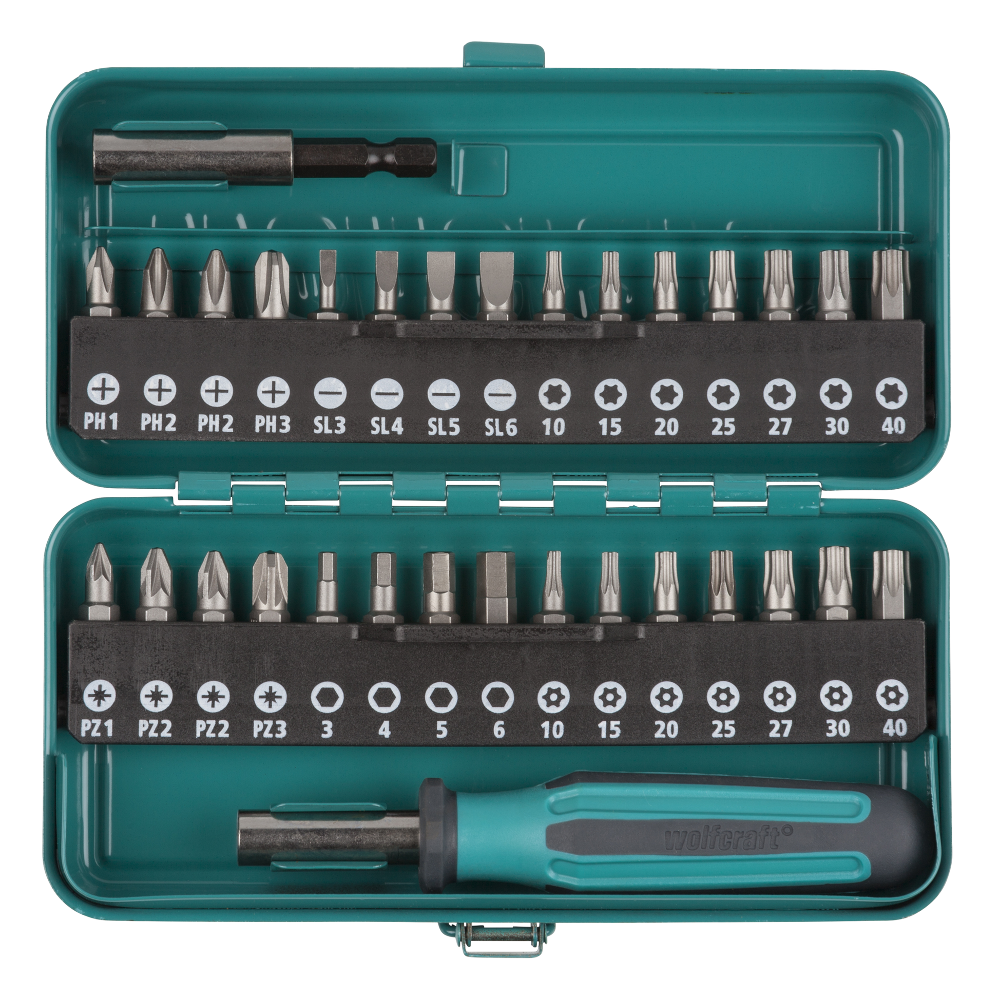 - 30 embouts Solid pour vis à empreinte cruciforme (PH/PZ), TORX® (T) et Hex en différentes tailles, avec porte-embouts magnétique
