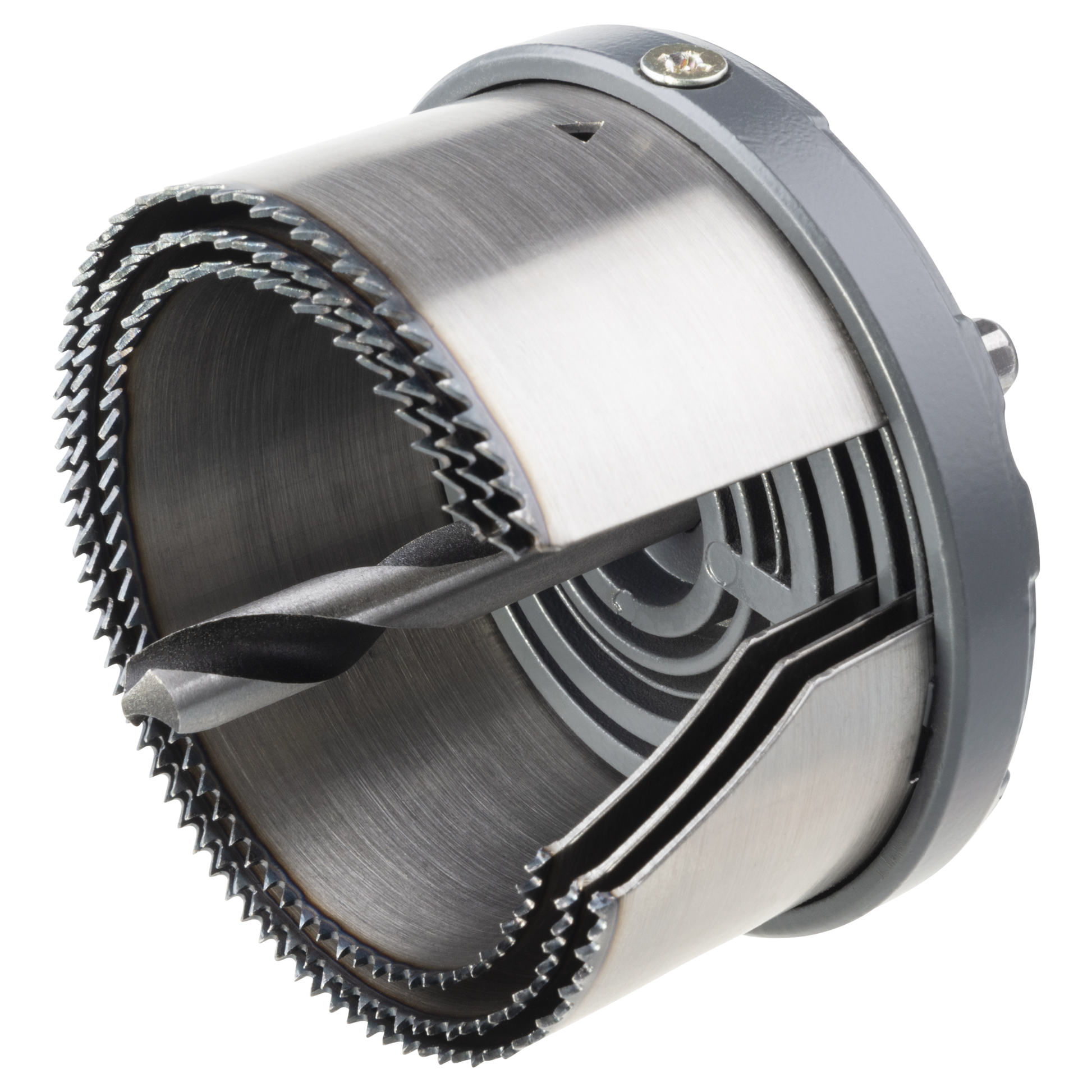 - 3 lames à changement rapide (Ø 60, 68, 74 mm), profondeur de coupe 33 mm, pour la préparation d'installations électriques, lumineuses et de tuyaux d'évacuation, denture fine pour une coupe nette et un haut rendement de coupe