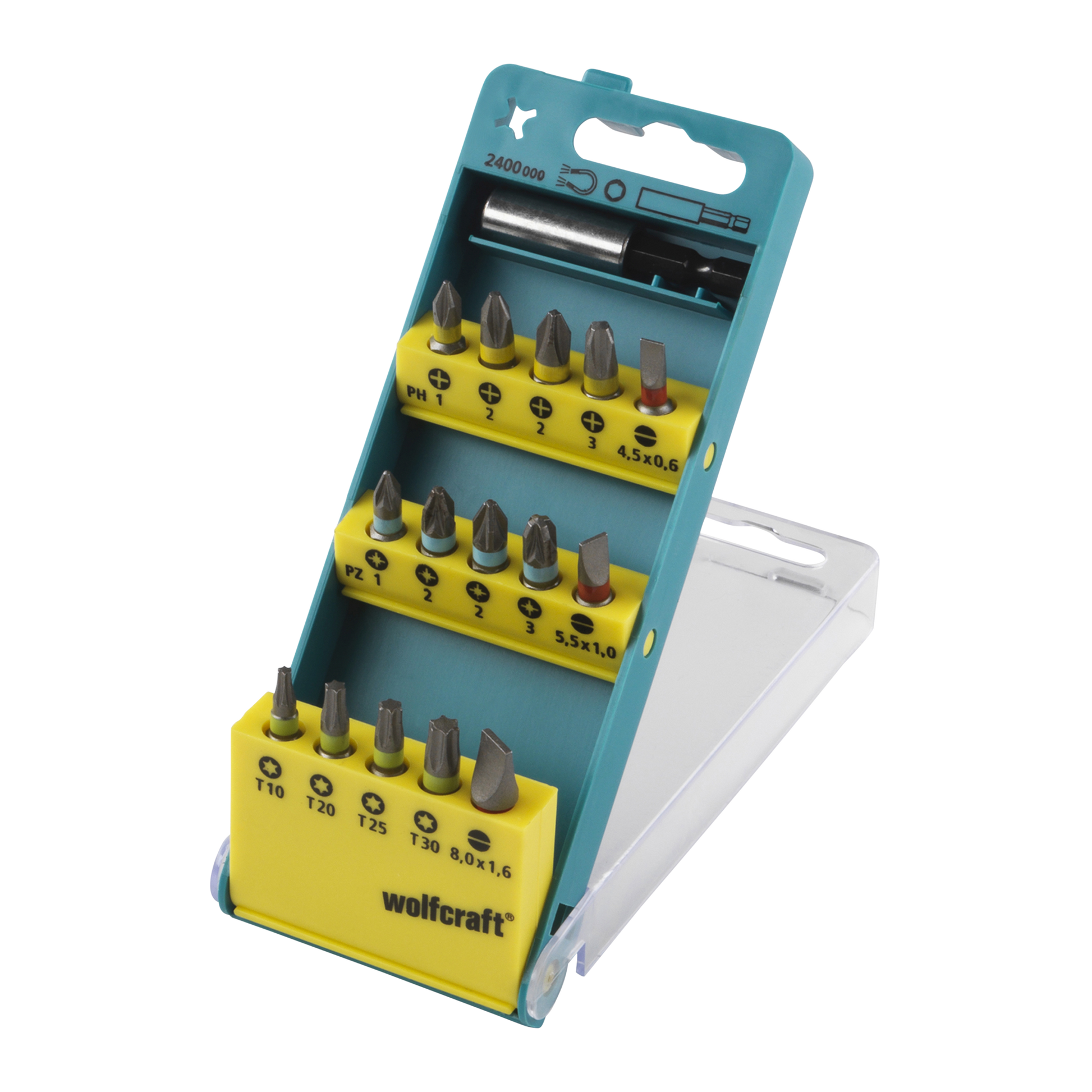- 15 embouts Solid pour vis à empreinte cruciforme (PH/PZ) et TORX® (T) en différentes tailles, avec porte-embouts magnétique