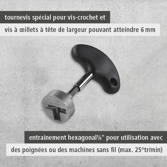 Tournevis spécial pour fixer facilement des vis-crochets et vis à œillet à tête de largeur pouvant atteindre 6 mm