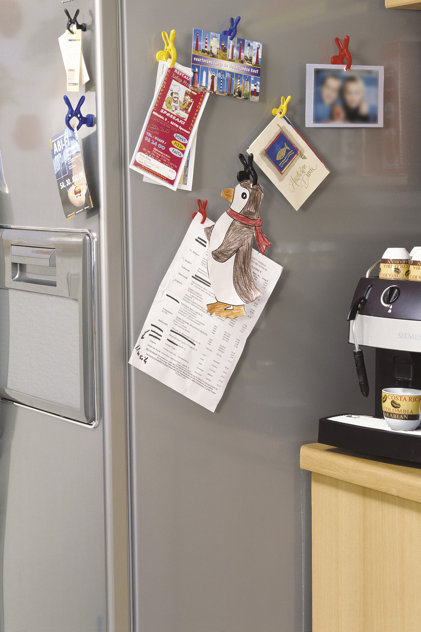Petite pince à ressort avec aimant permettant la fixation d'éléments sur une surface magnétique comme un mémo sur le réfrigérateur par exemple