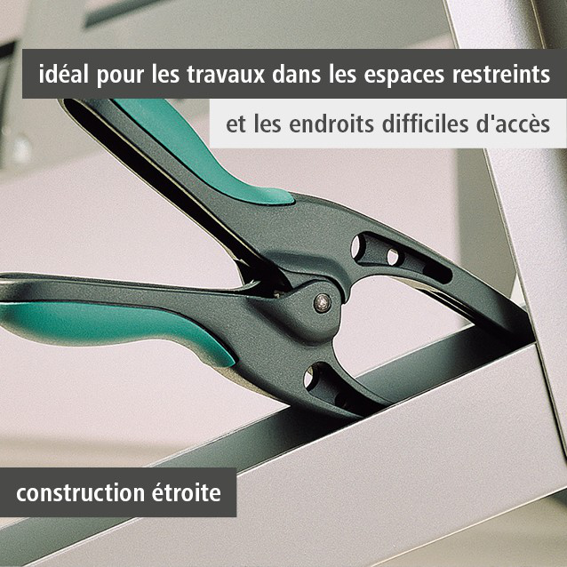 La poignée ergonomique bi-matière avec zone souple permet de travailler en toute sécurité et confortablement. La pince à ressort est fabriquée en plastique robuste renforcé de fibres de verre (PRV), ce qui lui assure une longue durée d’utilisation. Grâce à sa structure ajourée spéciale, la pince à ressort est très résistante et indéformable.