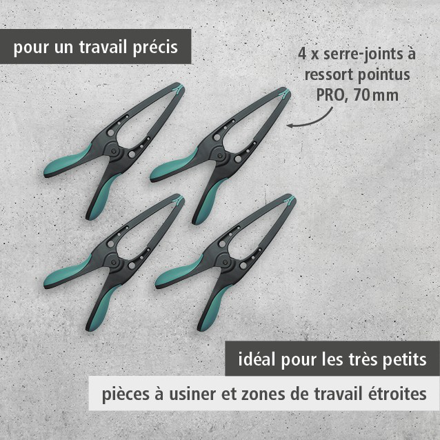 La pince à ressort bec long d’une ouverture de 70 mm est idéale pour les projets de bricolage et de modélisme, par exemple pour maintenir des éléments ou pour fixer des objets dans des zones éloignées des extrémités d’une pièce. Ses longs bras de serrage offrent une profondeur de serrage de 100 mm. La forme étroite facilite son utilisation dans des zones difficilement accessibles. Grâce aux mors de serrage souples de précision, il est possible d’appliquer la force de serrage avec précision tout en préservant les surfaces. Ils sont en outre pourvus d’une structure rainurée qui garantit un maintien optimal.