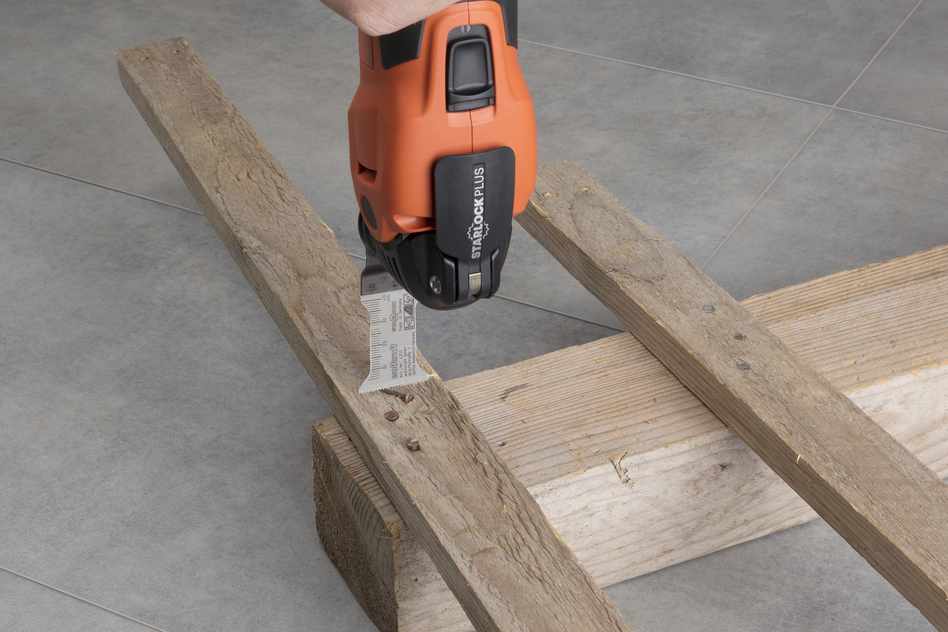 - lame BIM avec denture avoyée, denture pour découpes et coupes plongeantes dans le bois, le plastique, les plaques de plâtre et le bois avec clous