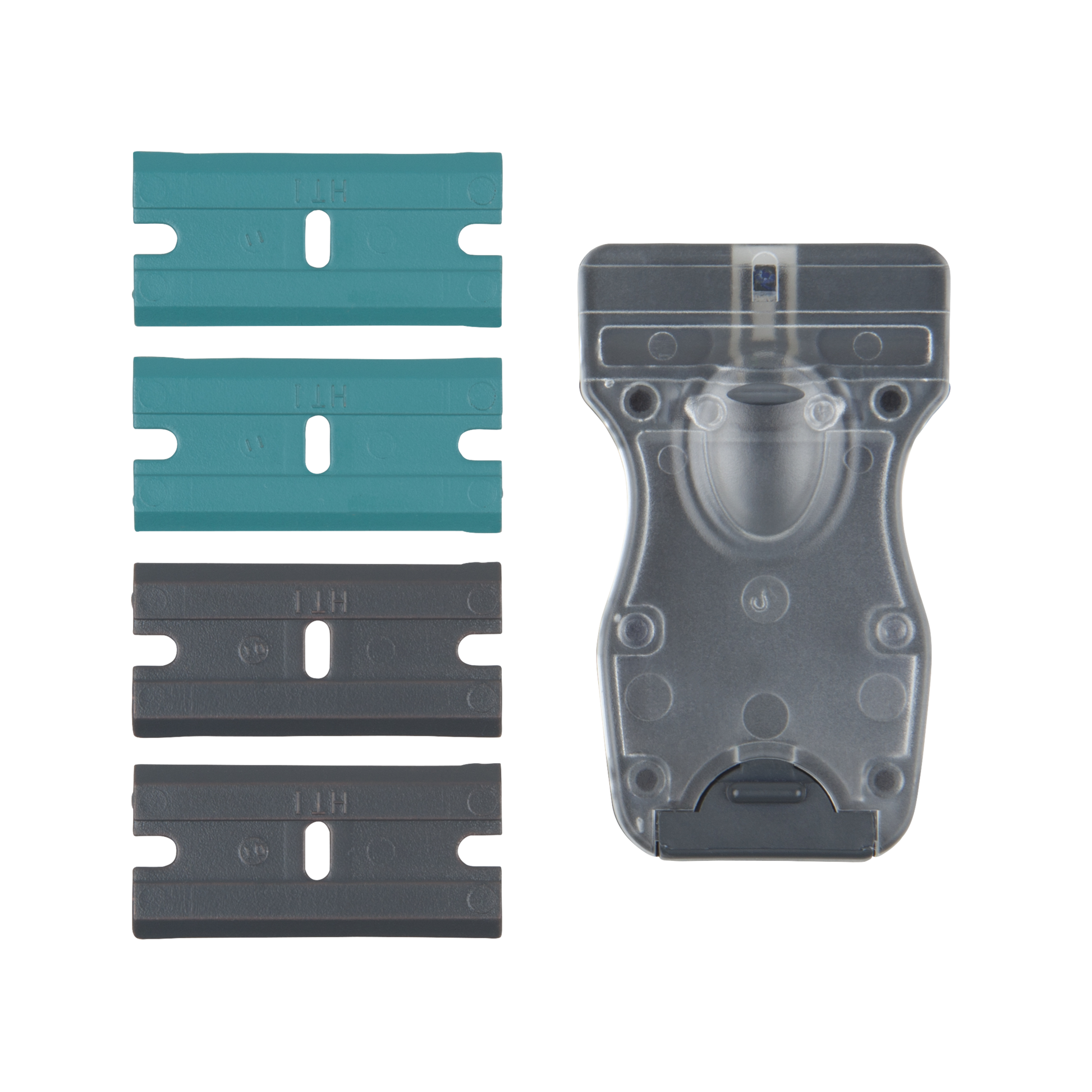 Ce grattoir permet d’éliminer les salissures et les résidus des surfaces fragiles comme le bois tendre ou la peinture de voitures, sans les abîmer. L’outil est fourni pour cela avec des lames en plastique réversibles, deux de dureté dure et deux de dureté moyenne. Vous disposez ainsi de l’outil adapté à toutes les sensibilités de surface. Une lame est déjà pré-installée dans l’outil, les trois autres se trouvent dans le compartiment dédié du boîtier en plastique. Le changement de lame s’effectue rapidement et sans outil.