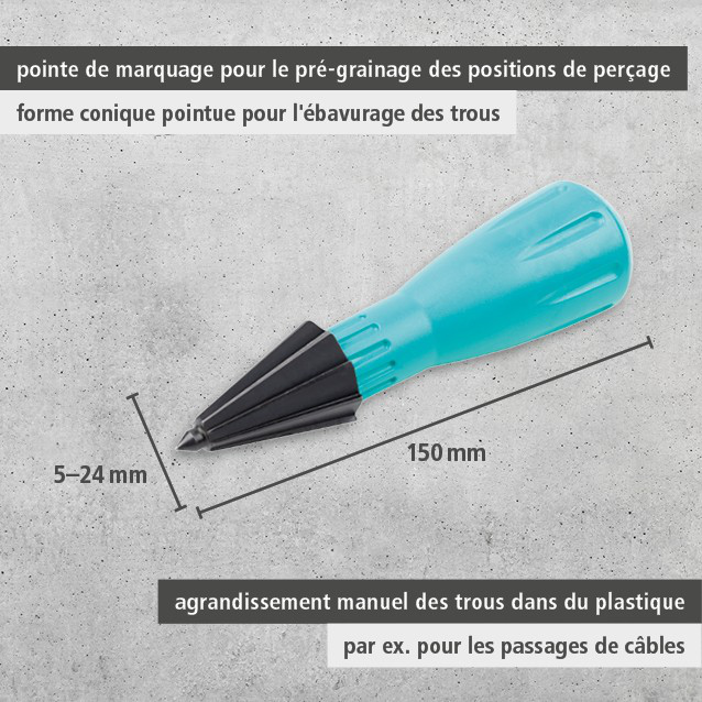 - La pointe de marquage vous permet de repérer les positions de perçage dans les dans les plaques de cloisons sèches et d’extraire les pièces en plastique prédécoupées de vos boîtes d’encastrement sans effort et en toute sécurité.