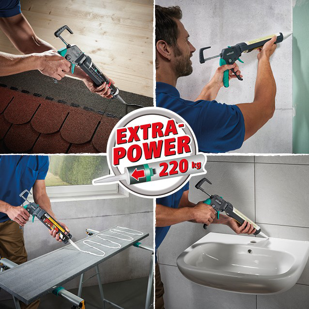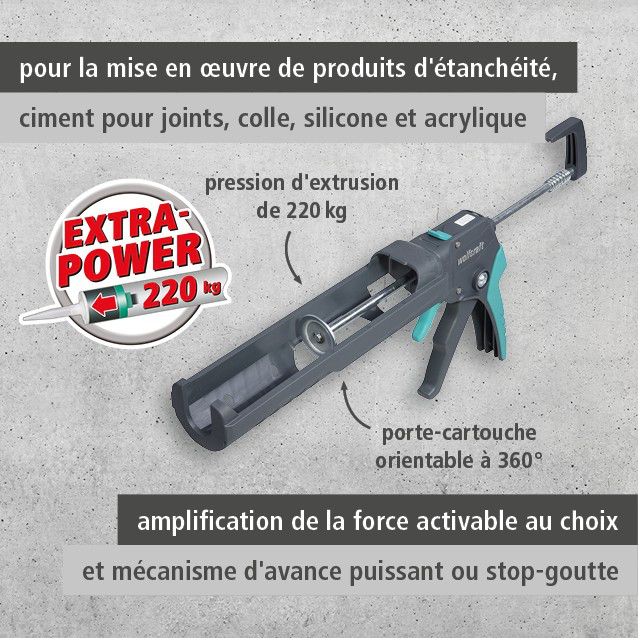 augmentation de la puissance d'extrusion pour une pression maximale de 220 kg - idéal pour l'application de mastics d'étanchéité et colles difficiles à extraire