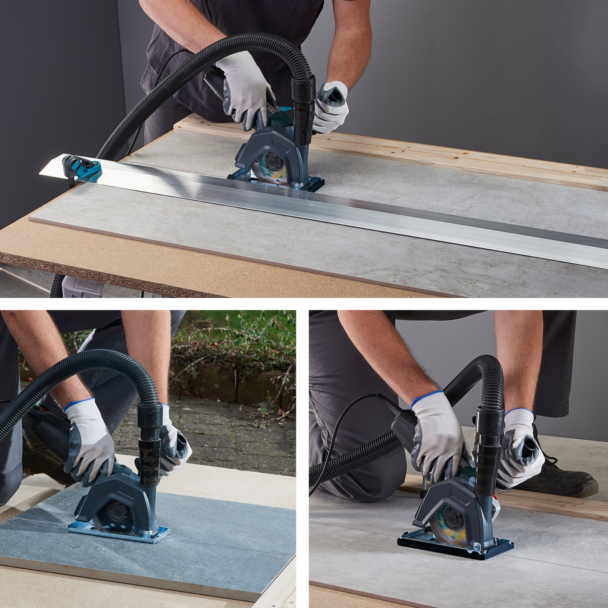 Capot d’aspiration avec glissière de guidage permettant un travail précis et sans poussière avec des disques à tronçonner diamantés de Ø 115 et 125 mm