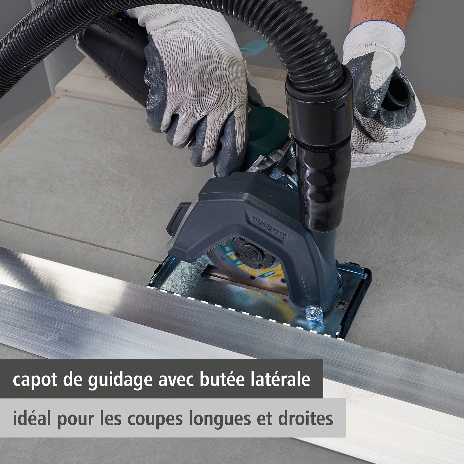 - guidage sûr et maîtrisé de la machine, et travail sans poussière avec des disques à tronçonner diamantés de Ø 115 / 125 mm