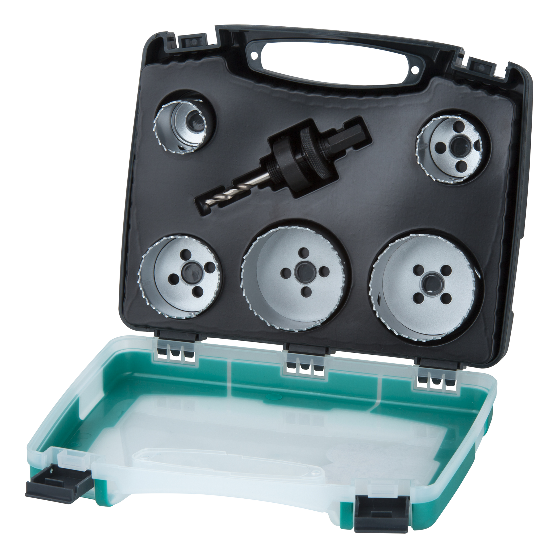 Ce jeu de 6 pièces est idéal pour la préparation d'installations sanitaires et pour le perçage dans le bois tendre et semi-dur, les panneaux d'isolation, les panneaux de cloison sèche, le plastique et le métal. Il contient 5 lames de scie cloche BIM d'un Ø de 25, 35, 43, 54 et 68 mm, un axe pilote avec filetage 5/8“ et un foret centreur (Ø 6 mm) en acier rapide HSS. Vous réalisez ainsi des perçages précis avec une profondeur de coupe de 55 mm. Le corps en alliage spécial avec denture HSS permet une longue durée de vie et un fonctionnement silencieux. La queue 6 pans de 11 mm permet de fixer les lames de scie cloche rapidement sur le porte-embout de votre perceuse ou de votre visseuse sans fil. Le jeu est fourni dans une boîte en plastique bi-matière de haute qualité dans laquelle vous pouvez transporter les pièces en sécurité et les ranger de façon ordonnée. Les lames de scie cloche sont contrôlées par le TÜV - Vous optez donc pour des produits sûrs de qualité.