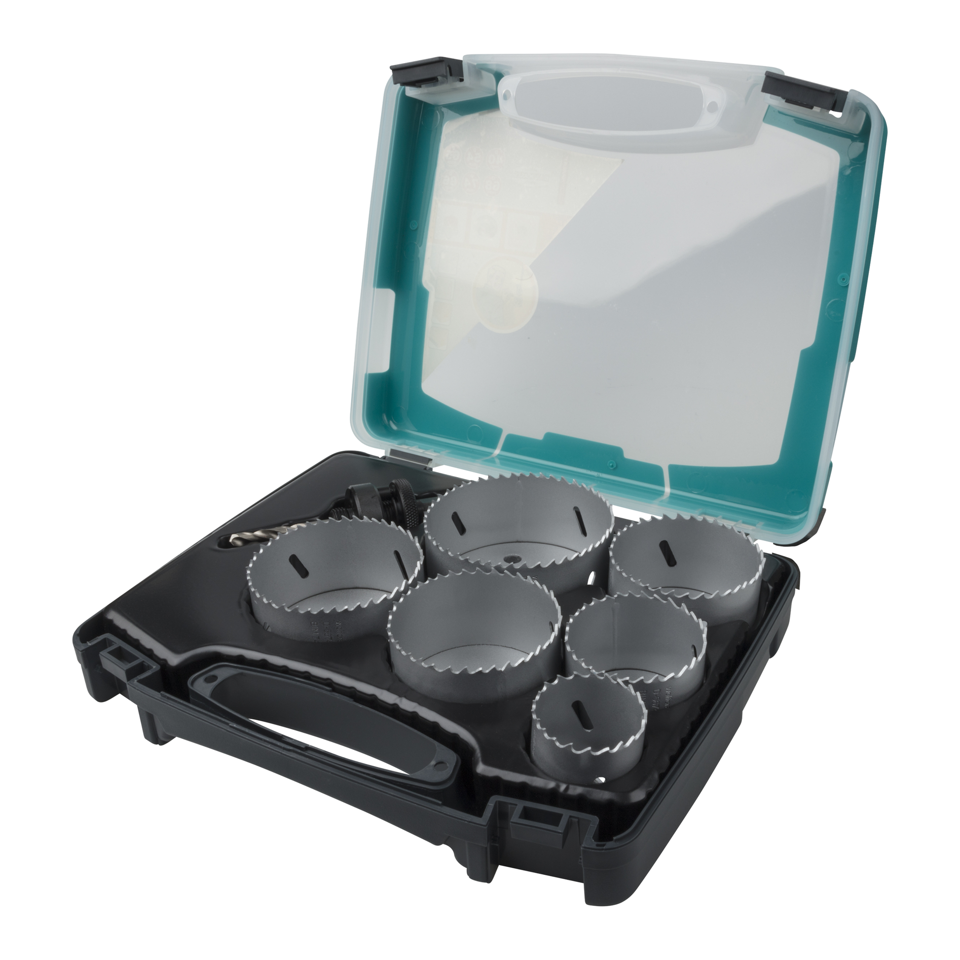 Ce jeu de 7 pièces est idéal pour la préparation d'installations électriques et pour le perçage dans le bois tendre et semi-dur, les panneaux d'isolation, les panneaux de cloison sèche, le plastique ou le métal. Il contient 6 lames de scie cloche BIM d'un Ø de 40, 54, 65, 68, 74 et 86 mm, un axe pilote avec filetage 5/8“ et un foret centreur (Ø 6 mm) en acier rapide HSS. Vous réalisez ainsi des perçages précis avec une profondeur de coupe de 55 mm. Le corps en alliage spécial avec denture HSS permet une longue durée de vie et un fonctionnement silencieux. La queue 6 pans (Ø 11 mm) permet de fixer les lames de scie cloche rapidement sur le porte-embout de votre perceuse ou de votre visseuse sans fil. Le jeu est fourni dans une boîte en plastique bi-matière de haute qualité dans laquelle vous pouvez transporter les pièces en sécurité et les ranger de façon ordonnée. Les lames de scie cloche sont contrôlées par le TÜV - Vous optez donc pour des produits sûrs de qualité.