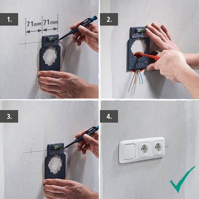 - Cotes de 71 mm et repères sur tous les côtés pour reporter facilement les distances correctes entre deux boîtes d’encastrement, utilisable aussi pour l’ajout de nouvelles prises