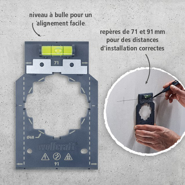 Le niveau à bulle vous permet de positionner le gabarit avec précision afin de marquer les positions de perçage. Le gabarit vous aide également à aligner ultérieurement les boîtes d’encastrement et les prises, de sorte que le positionnement soit précis et sûr.