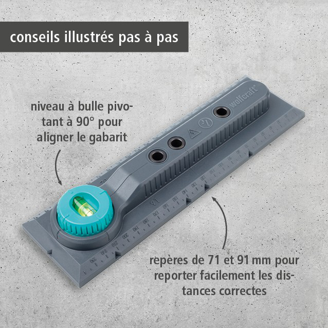 - niveau à bulle pivotant à 90° pour aligner le gabarit horizontalement et verticalement pour le marquage exact de la position de perçage et pour aligner les boîtes d’encastrement et les prises