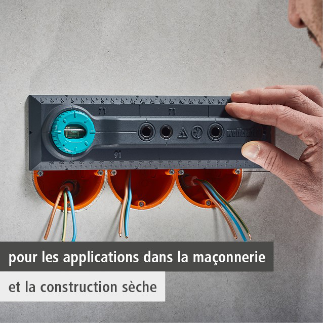 - repères de 71 et 91 mm pour reporter facilement les distances correctes entre deux boîtes d’encastrement ainsi que les prises de courant, les prises de télévision ou de réseau