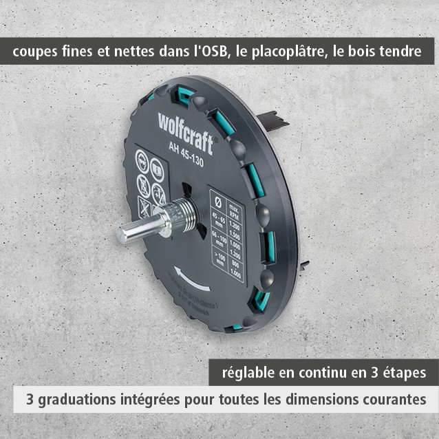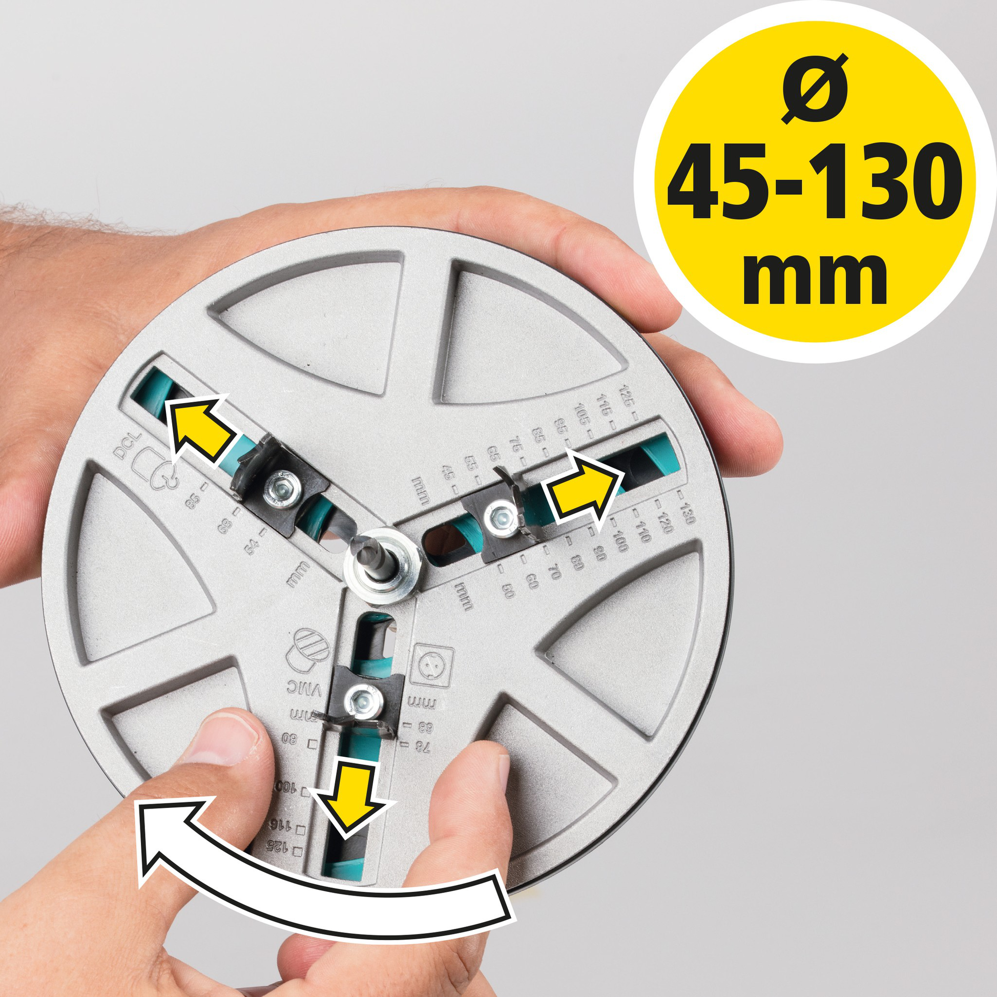 Cette scie cloche réglable vous permet d’obtenir tous les perçages souhaités entre 45 et 130 mm. Vous n’avez besoin que d’un produit pour une grande variété de diamètres ! Les trois groupes de trois dents scient sans aucune difficulté les plaques de plâtre et les panneaux de bois tendre pour une coupe fine et nette grâce à leur denture spéciale avoyée. Le réglage de la taille s'effectue en 3 étapes simples : le desserrage, l'ajustage synchrone et la fixation. La graduation millimétrique intégrée ainsi que des graduations supplémentaires pour les diamètres d'installation courants vous permettent de trouver le bon rayon du premier coup d'œil. Le grand plateau de perçage permet de protéger la zone de travail. Des ouvertures de taille suffisante sont prévues pour évacuer efficacement la poussière pendant la rotation et pour empêcher le blocage dans la cloche. Le fonctionnement du mécanisme de réglage reste par conséquent garanti durablement, même quand les quantités de poussière sont importantes.