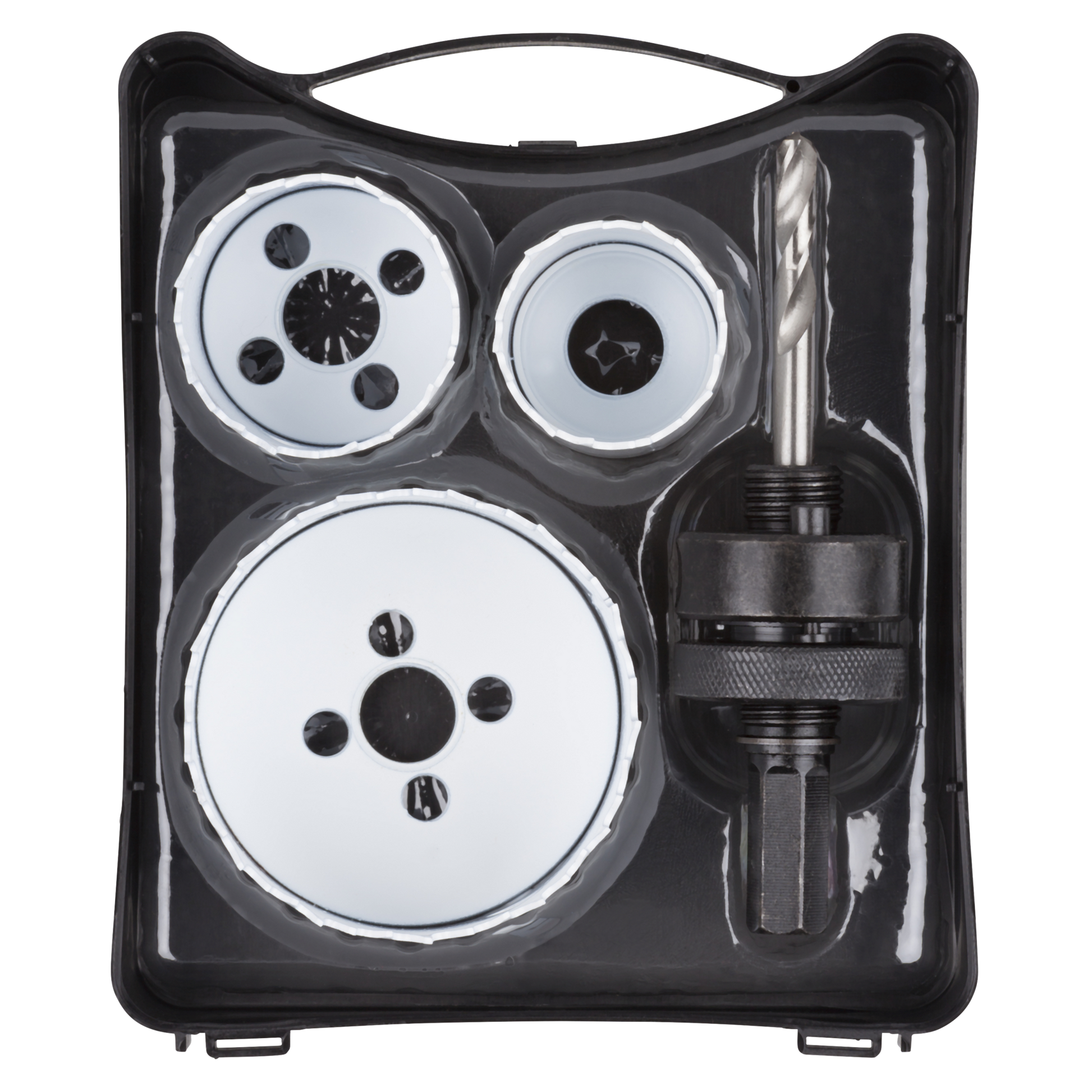 Ce jeu de 4 pièces est idéal pour la rénovation d'une maison ou d'un appartement et pour le perçage dans le bois, les panneaux d'isolation, les panneaux de cloison sèche, le plastique et le métal. Il contient 3 lames de scie cloche BIM de 35, 43 et 68 mm de diamètre, un axe pilote avec queue 6 pans Ø 11 mm avec filetage de 5/8“ et un foret centreur foret (Ø 6 mm) en acier rapide (HSS). Vous réalisez ainsi des perçages précis avec une profondeur de coupe de 40 mm. La queue 6 pans permet de fixer les lames de scie cloche rapidement au porte-embout de votre perceuse ou de votre visseuse sans fil. Le jeu est fourni dans une boîte en plastique dans laquelle vous pouvez transporter les pièces en sécurité et les ranger de façon ordonnée. Les lames de scie cloche sont contrôlées par le TÜV - Vous optez donc pour des produits sûrs de qualité.