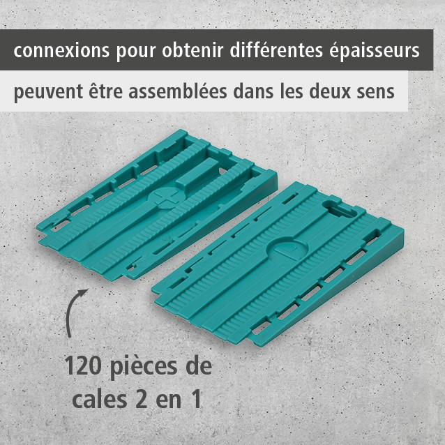 Les cales universelles de wolfcraft peuvent être assemblées dans les 2 sens. Vous pourrez utiliser cet accessoire malin soit comme un espaceur plat, soit comme une grande cale lorsque les deux pointes sont fixées dans la même direction. Grâce au crantage, vous déterminez précisément l'épaisseur de l'espacement souhaité et pouvez régler plusieurs cales à la même dimension. Une fois reglées et bloquées, les cales conservent leur position et leur épaisseur de manière fiable pour éviter les règlages fréquents. Idéales lors de la pose de parquet ou de sol stratifié, lors de la pose de portes et fenêtres par exemple.