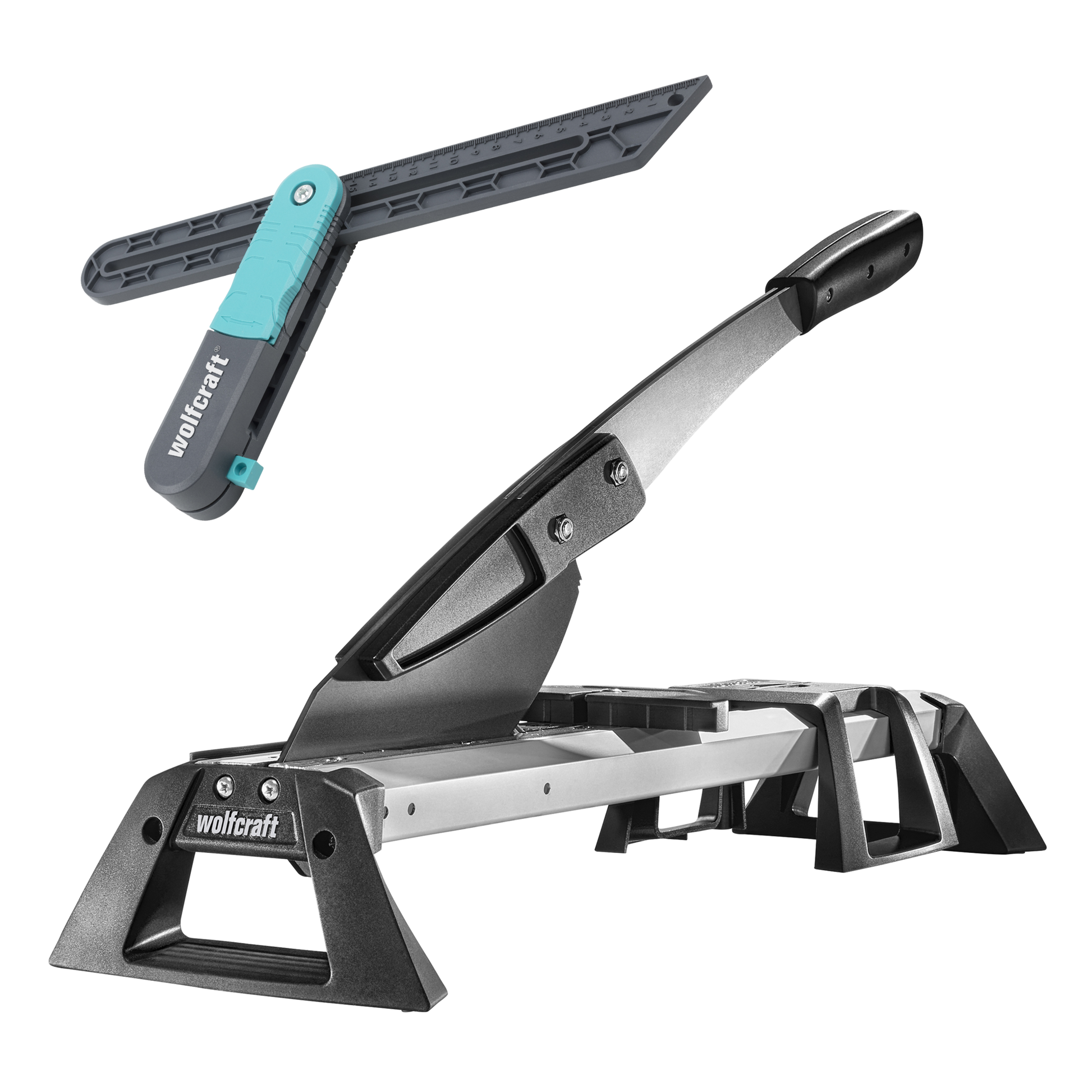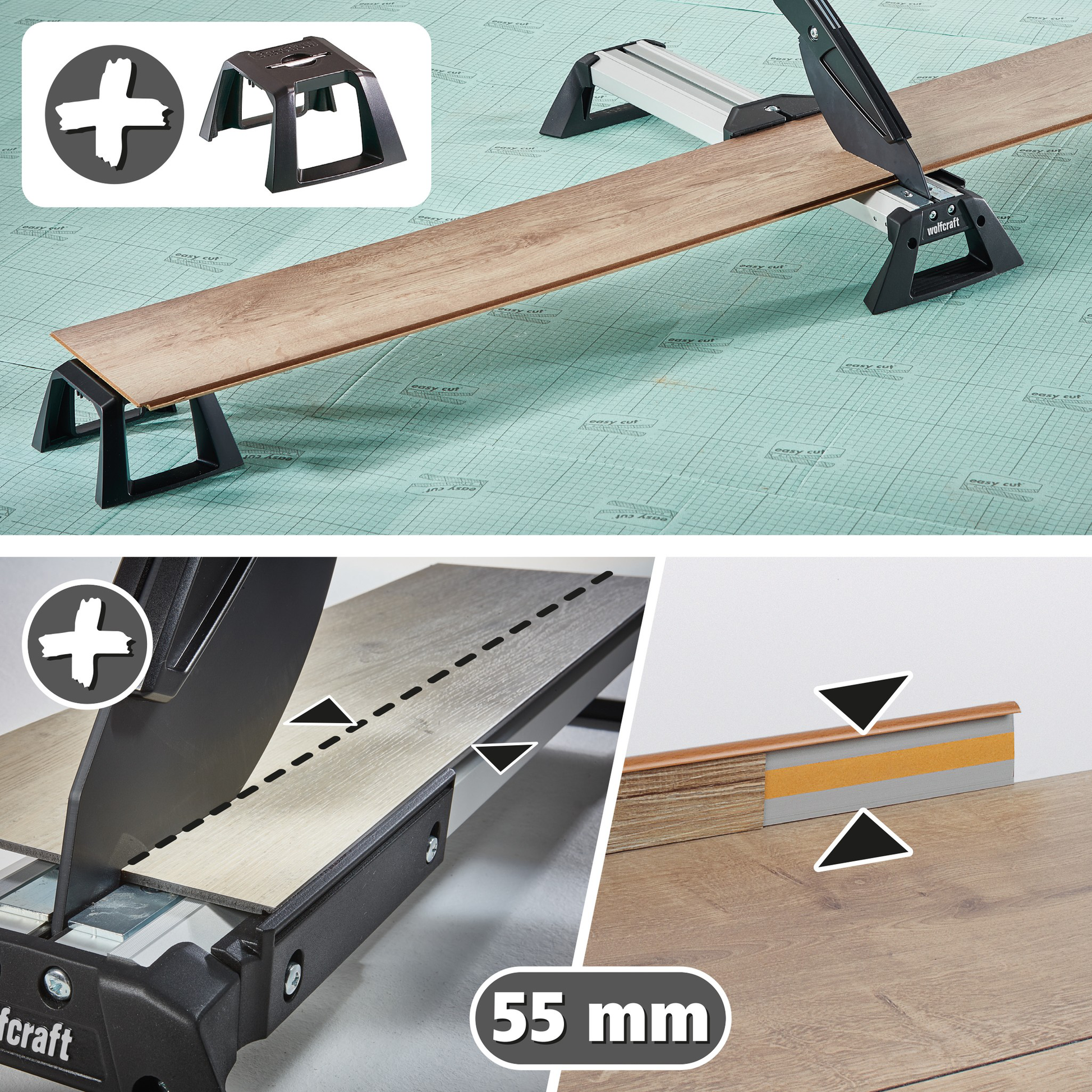 Presse coupante pour sols stratifiés et vinyle avec géométrie des lames résistante pour la coupe facile de tous les types de sols stratifiés, y compris ceux à sous-couche intégrée, jusqu’à 11 mm d’épaisseur et 465 mm de largeur
